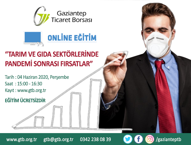 Bu bağlamda, Borsamız tarafından "Tarım ve Gıda Sektörlerinde Pandemi Sonrası Fırsatlar" konulu online eğitim gerçekleştirilecektir.