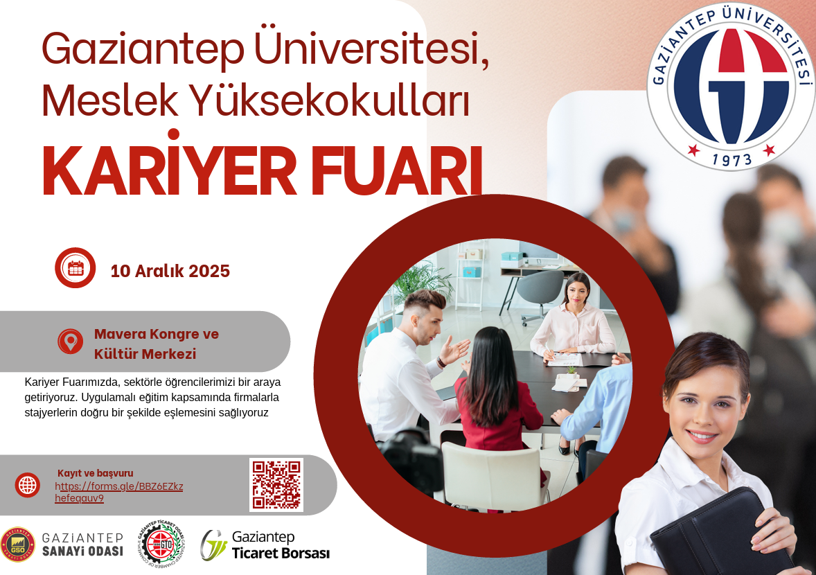 Türkiye Odalar ve Borsalar Birliği (TOBB) ile Yükseköğretim Kurulu (YÖK) arasında imzalanan "Meslek Yüksekokulları Eğitim İş Birliği Protokolü" kapsamında; Gaziantep Üniversitesi Sosyal Bilimler Meslek Yüksekokulu ile Gaziantep Üniversitesi Kariyer Merkezi iş birliğiyle, Gaziantep Sanayi Odası (GSO), Gaziantep Ticaret Odası (GTO) ve Gaziantep Ticaret Borsası (GTB) katkılarıyla, 10 Aralık 2025 tarihinde Mavera Kongre ve Kültür Merkezi'nde, tüm Meslek Yüksekokullarına yönelik olarak "Gaziantep Üniversitesi Meslek Yüksekokulları Kariyer Fuarı" düzenlenecektir.