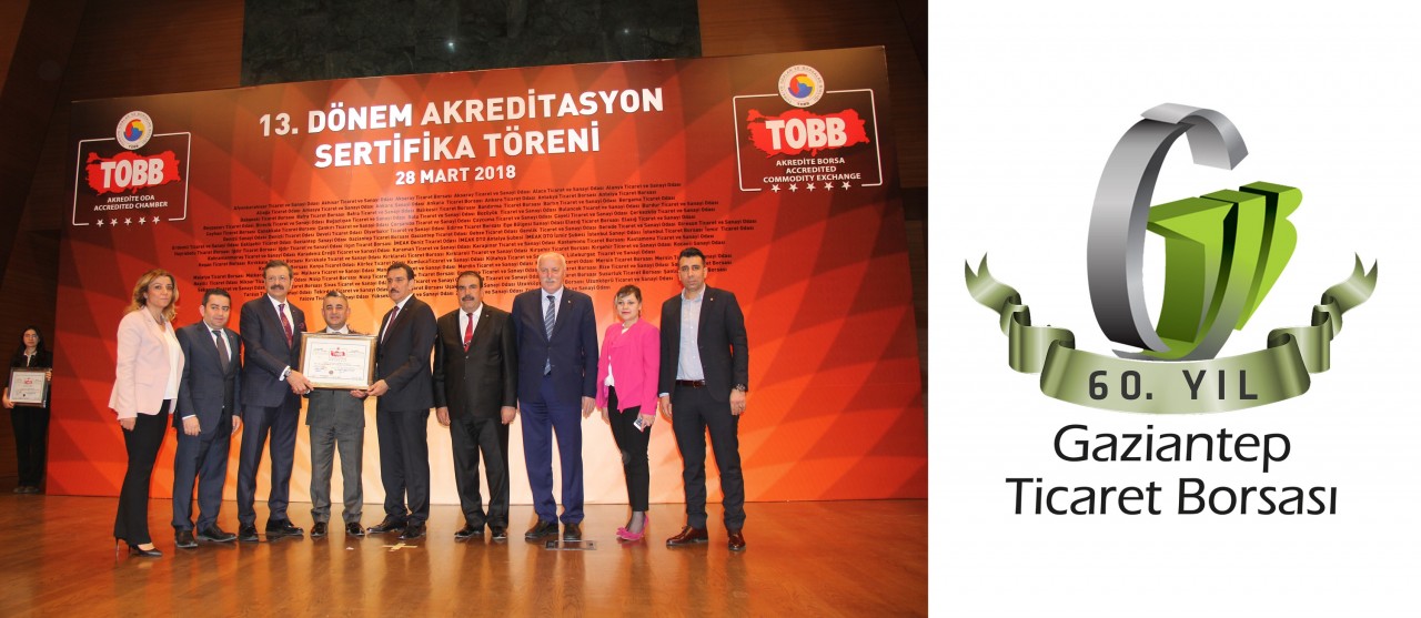 Gaziantep Ticaret Borsası (GTB), Türkiye Odalar ve Borsalar Birliği (TOBB) tarafından düzenlenen 13. Dönem Akreditasyon Sertifika töreninde, Güneydoğu Anadolu Bölgesinde 5 Yıldızlı, A sınıfı Akreditasyon’ sertifikası almaya hak kazanan tek borsa oldu. 2017 yılı içerisinde gerçekleştirilen TOBB akreditasyon denetimlerinde puanını yükselterek, A sınıfı borsa seviyesini koruma başarısı gösteren GTB, Türkiye genelinde ise denetimlerde en yüksek puan alan ilk 5 oda/borsa arasında yer aldı. GTB Meclis Başkanı Selami Memiş, A sınıfı akredite borsa sertifikasını, Gümrük ve Ticaret Bakanı Bülent Tüfenkci ile TOBB Başkanı Rıfat Hisarcıklıoğlu’nun elinden aldı.