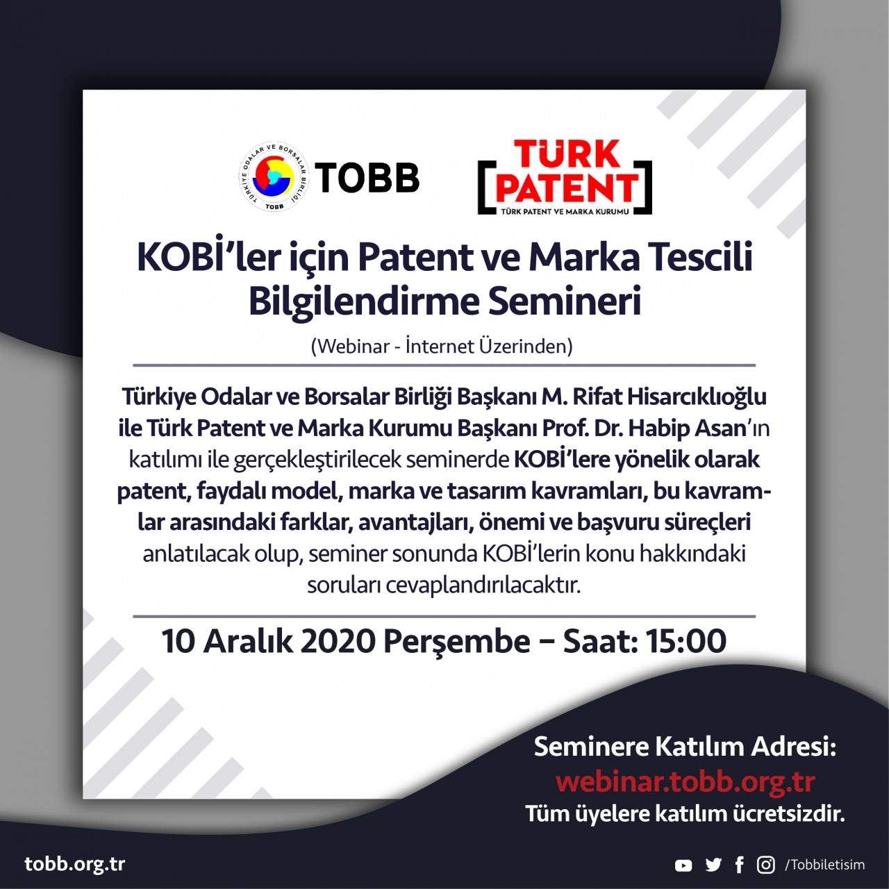 Türkiye Odalar ve Borsalar Birliği Başkanı Sayın M. Rifat Hisarcıklıoğlu ile Türk Patent ve Marka Kurumu Başkanı Prof. Dr. Sayın Habip Asan'ın katılımı ile gerçekleştirilecek seminerde KOBİ'lere yönelik olarak patent, faydalı model, marka ve tasarım kavramları, bu kavramlar arasındaki farklar, avantajları, önemi ve başvuru süreçleri anlatılacak olup, seminer sonunda KOBİ'lerin konu hakkındaki soruları cevaplandırılacaktır.