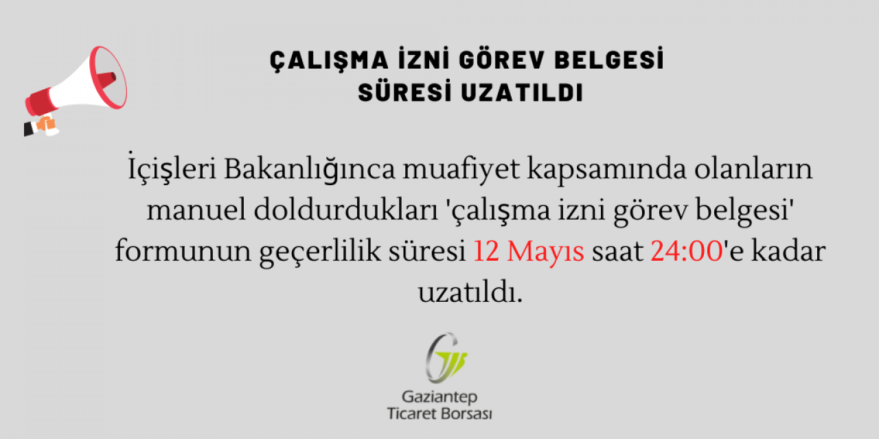 İçişleri Bakanlığı tarafından muafiyet kapsamındaki işveren ve çalışanların manuel olarak doldurdukları çalışma izni görev belgesi formunun geçerlilik süresi 12 Mayıs 2021 Çarşamba Günü saat 24.00’e kadar uzatıldı.