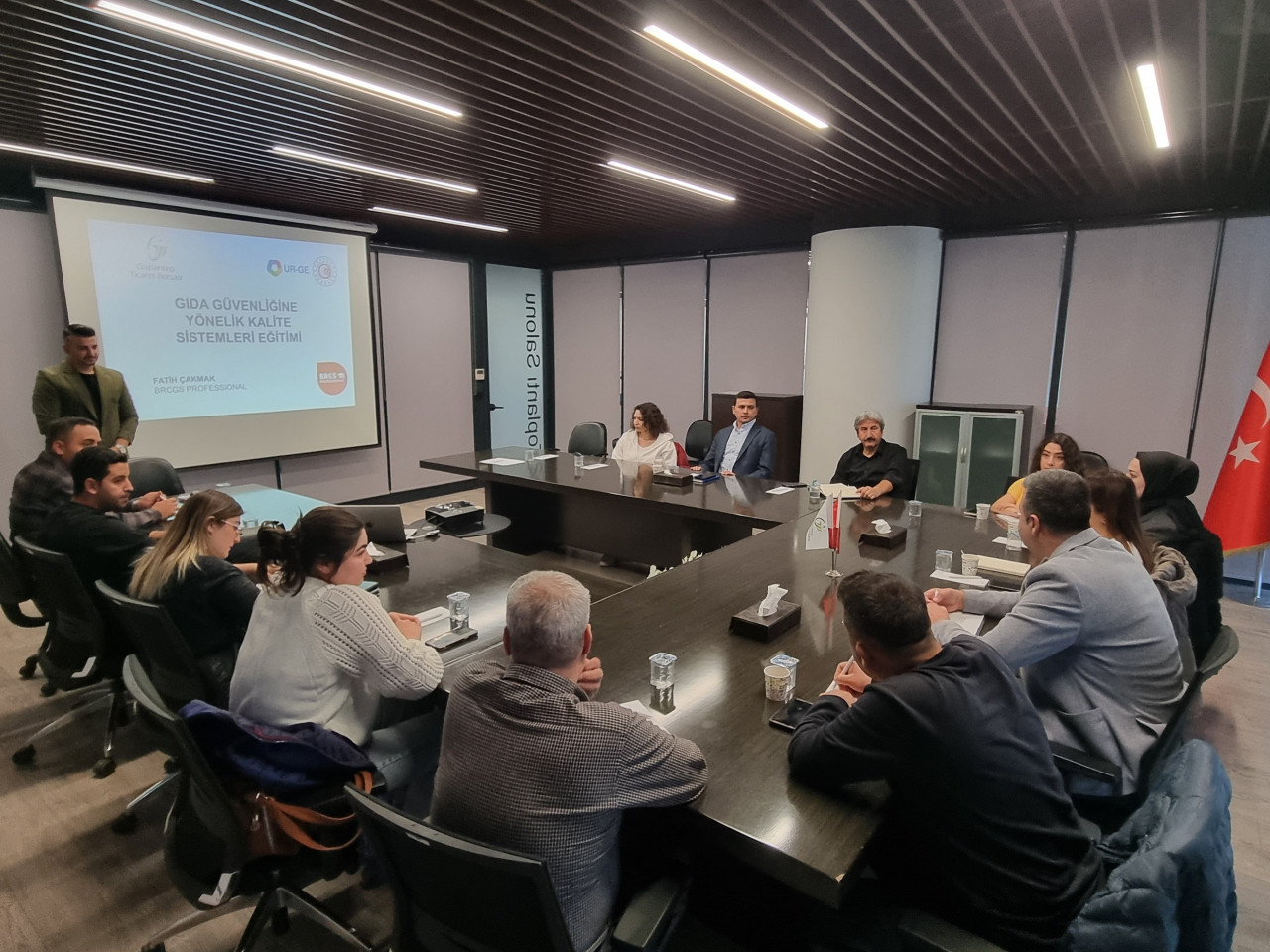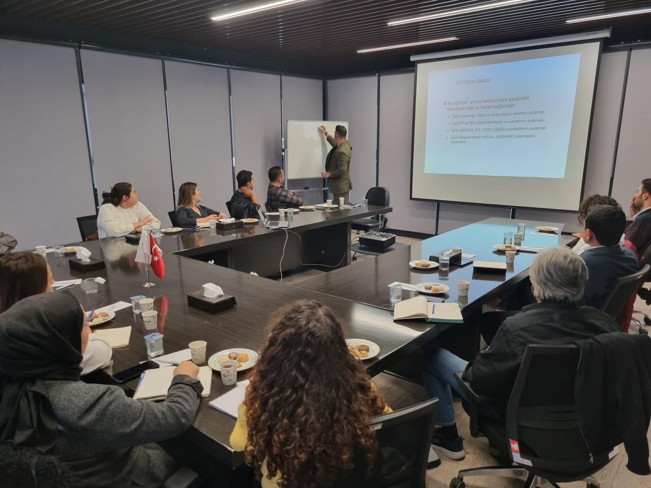 Açılış konuşmasının ardından gerçekleştirilen eğitimde Uzman Eğitmen Çakmak, gıda güvenliği, kalite ve gıda hijyeninin önemi, HACCP ve ISO 22000 terimleri, GFSI (BRCGS, IFS, FSSC 22000) standartları ile ürün belgelendirme (Helal, Kosher) sistemleri hakkında katılımcılara detaylı bilgiler verdi.