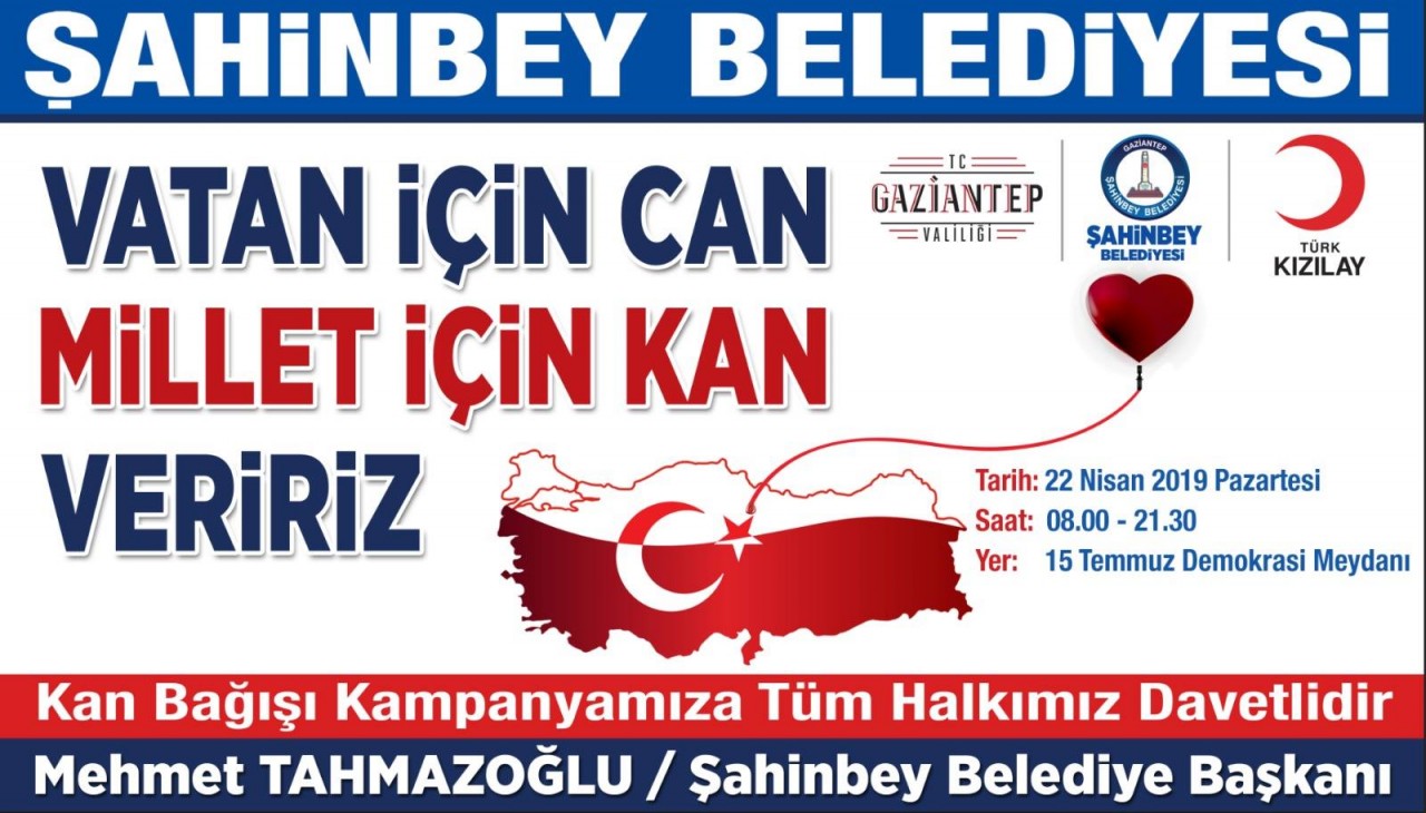 Gaziantep Valiliği koordinasyonunda, Şahinbey Belediyesi ve Türk Kızılay'ı Gaziantep Kan Bağışı Merkezi işbirliğinde sanayi şehri olan Gaziantep ilimizin sağlık sorunlarına duyarlı bir yaklaşımda bulunmak ve Türk Kızılay'ı Gaziantep Kan Bağışı Merkezi sorumluluk sahasındaki kan ihtiyacını karşılamak amacı ile gönüllü bağışla kan alma sürecine destek olmak adına 22 Nisan 2019 Pazartesi günü 08:00-21:30 saatleri arasında 15 Temmuz Demokrasi Meydanında "Vatan İçin Can, Millet İçin Kan Veririz" sloganı ile "Kan Bağışı Kampanyası" düzenlenecektir.