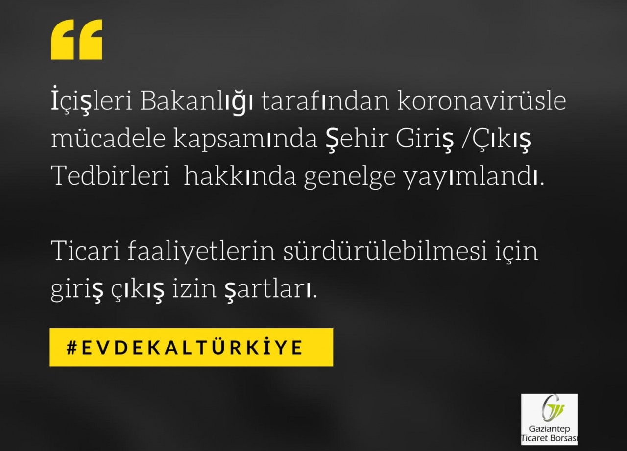 b-) Yurt içinde ticari yük/yolcu taşımacılığı yapanlar ile uluslararası yük taşımacılığı yapanların giriş-çıkış yasağı getirilen illerimizden transit şekilde geçişlerine müsaade edilecektir. Bu şekilde transit geçişlerine izin verilen ticari yük taşıyıcıları belirtilen illerde zorunlu dinlenme molaları/süreleri hariç hiçbir şekilde duraklama ya da konaklama yapamayacaklardır. Kavaklıdere Mah.Atatürk Bulvarı 191/C Ayrıntılı bilgi için irtibat: Hüseyin HANCIOĞLU Telefon:(0312) 422 42 91 Faks : (0312) 4224220 AB Uzman Yardımcısı