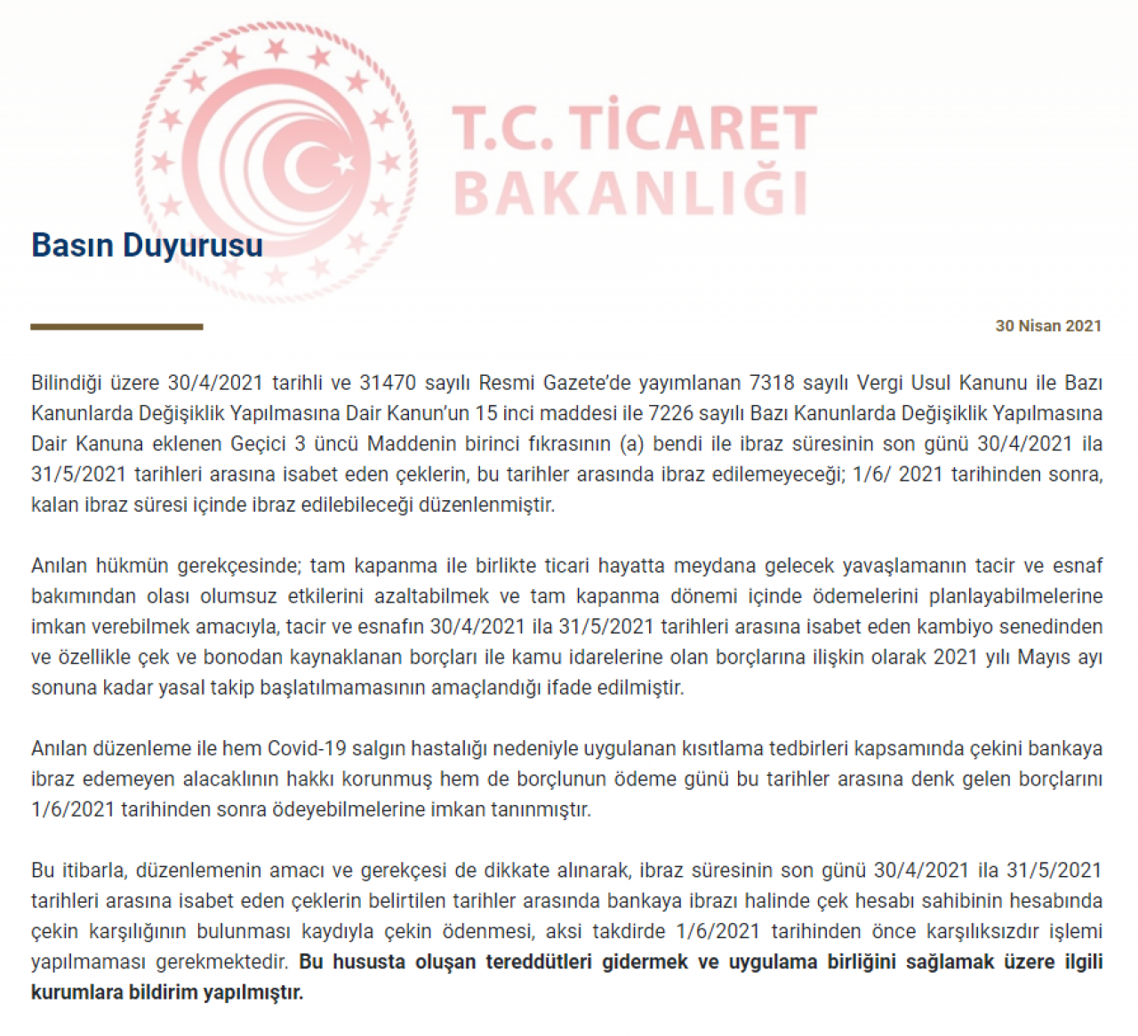 Ticaret Bakanlığı tarafından Çek düzenlemesiyle ilgili oluşan tereddütleri gidermek ve uygulama birliğini sağlamak amacıyla ilgili kurumlara yönelik bildirim yapılmıştır.