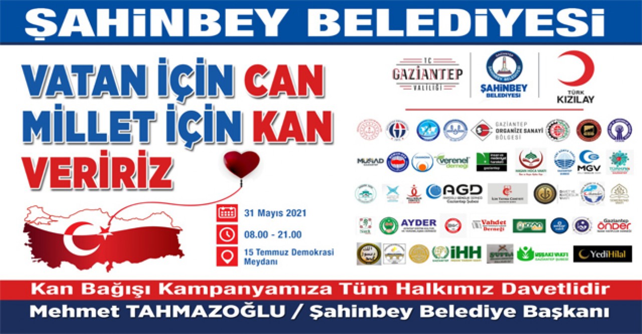 Gaziantep Valiliğimiz koordinasyonunda, Şahinbey Belediyemiz ve Türk Kızılay’ı Gaziantep Kan Bağışı Merkezi işbirliğinde sanayi şehri olan Gaziantep ilimizin sağlık sorunlarına duyarlı bir yaklaşımda bulunmak ve Türk Kızılay’ı Gaziantep Kan Bağışı Merkezi sorumluluk sahasındaki kan ihtiyacını karşılamak amacı ile gönüllü bağışla kan alma sürecine destek olmak adına 31 Mayıs 2021 Pazartesi günü 08:00-­21:00 saatleri arasında 15 Temmuz Demokrasi Meydanında “Vatan İçin Can, Millet İçin Kan Veririz” sloganı ile “Kan Bağışı Kampanyası” düzenlenecektir.