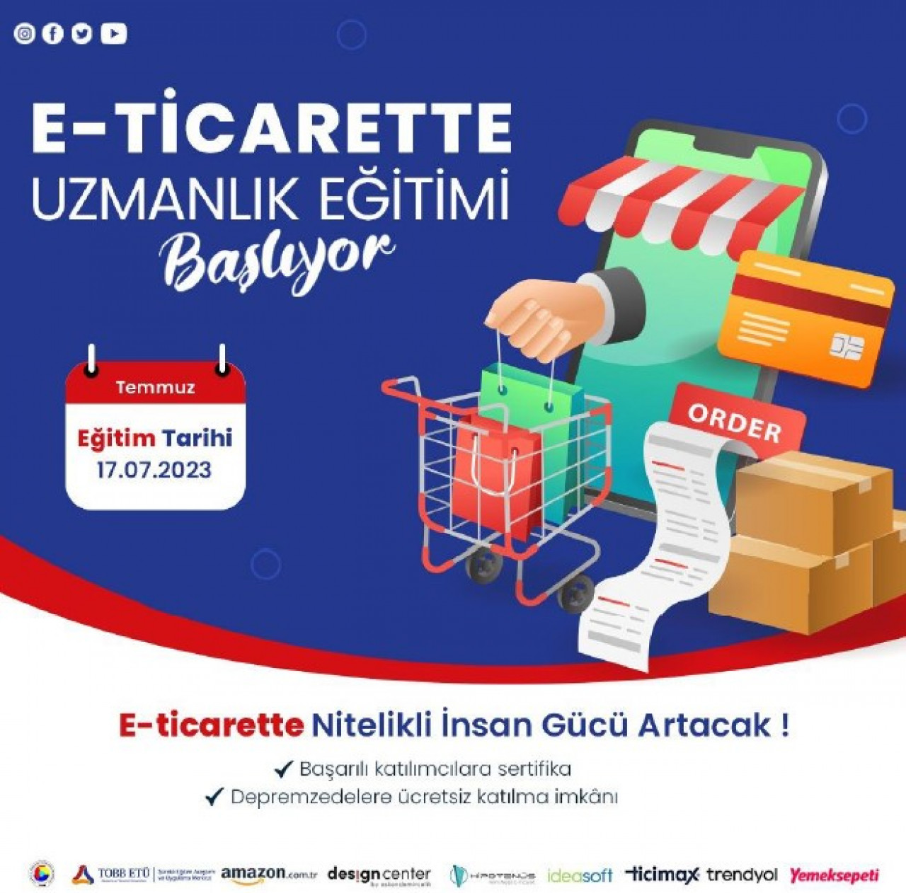 Türkiye Odalar ve Borsalar Birliği koordinasyonunda; başta Amazon Türkiye, Trendyol ve Yemeksepeti olmak üzere, Askon Design Center, Hipotenüs, Ideasoft, Ticimax ve TOBB ETÜ Sürekli Eğitim Merkezi (SEM) işbirliği ve katkılarıyla 17 Temmuz 2023 tarihinde E-Ticarette Uzmanlık Eğitimi başlatılacaktır.