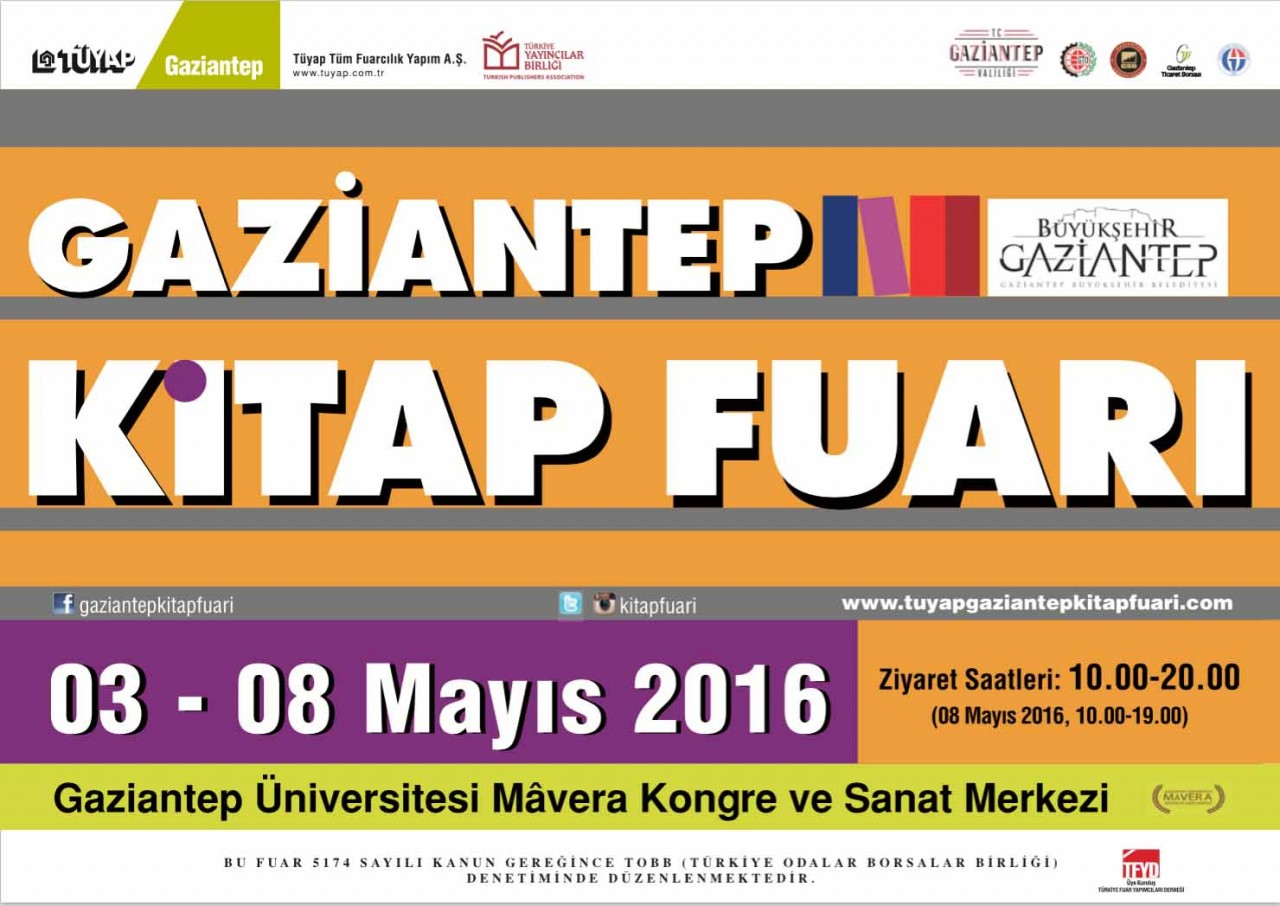 03-08 Mayıs 2016 tarihleri arasında Gaziantep Üniversitesi Mavera Kongre ve Sanat Merkezinde kitap fuarı düzenlenecektir.