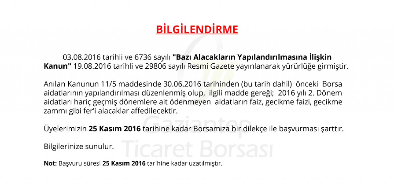 Anılan Kanunun 11/5 maddesinde 30.06.2016 tarihinden (bu tarih dahil) önceki Borsa aidatlarının yapılandırılması düzenlenmiş olup, ilgili madde gereği; 2016 yılı 2. Dönem aidatları hariç geçmiş dönemlere ait ödenmeyen aidatların faiz, gecikme faizi, gecikme zammı gibi fer’i alacaklar affedilecektir.