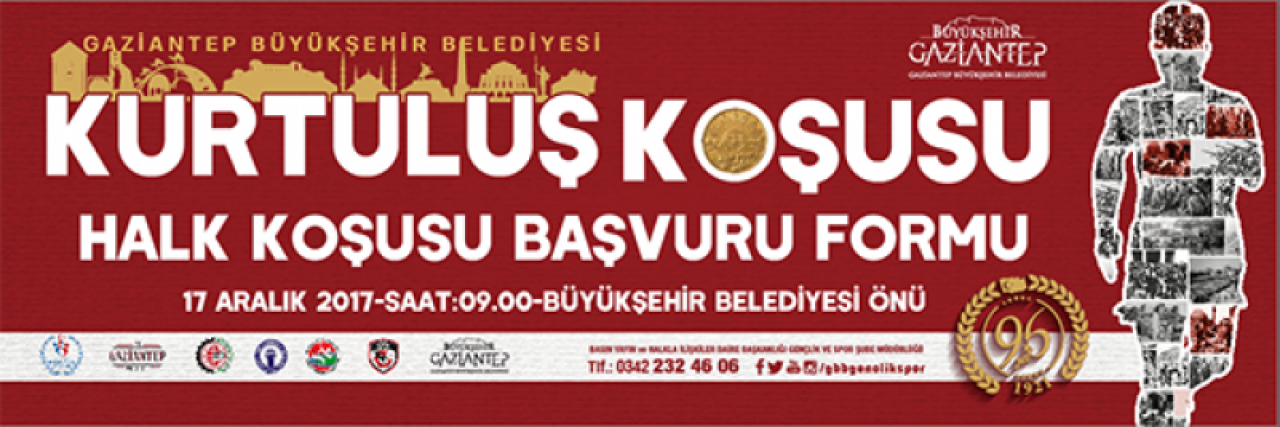 Gaziantep Büyükşehir Belediyesi tarafından Gaziantep Valiliği Koordinasyonunda, Türkiye Atletizm Federasyonu, Üniversitelerimiz, Gençlik Hizmetleri ve Spor İl Müdürlüğü, İl Milli Eğitim Müdürlüğü, İl Emniyet Müdürlüğü, Gaziantep Ticaret Odası, Gaziantep Esnaf ve Sanatkarlar Odaları Birliği ve Gazişehir Gaziantep Futbol Kulübü iş birliğinde Kentimizin Kurtuluşunun 96. Yılı Kutlamaları çerçevesinde 17 Aralık 2017 Pazar günü saat 09.00'da Gaziantep Savunması Anısına "Kurtuluş Koşusu" organizasyonu gerçekleşecektir. Gaziantep Büyükşehir Belediye Başkanlığı önünden başlayacak etkinliğin detaylı bilgi ve başvuruları www.gaziantep.com.tr adresinden yapılmaktadır.