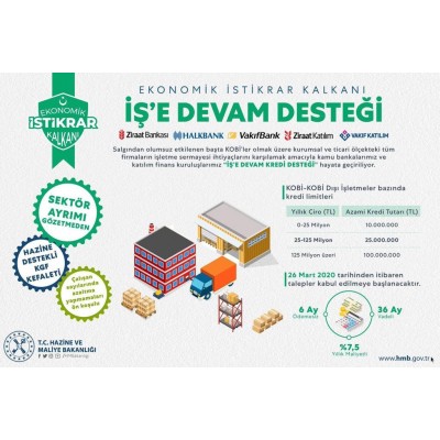 Oda ve Borsalarımızın kurucu ortağı olduğu Kredi Garanti Fonu (KGF) kefaleti ile "İş'e Devam Kredi Desteği" kapsamında 6 ay anapara ve faiz ödemesiz, toplam 36 ay vadeli ve yıllık %7,5 faiz oranlı kredi başvuruları Ziraat Bankası, Halkbank, Vakıfbank, Ziraat Katılım ve Vakıf Katılım bankaları tarafından 26.03.2020 tarihinden itibaren alınmaya b...