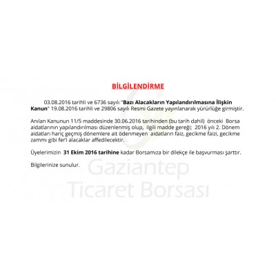 Anılan Kanunun 11/5 maddesinde 30.06.2016 tarihinden (bu tarih dahil) önceki Borsa aidatlarının yapılandırılması düzenlenmiş olup, ilgili madde gereği; 2016 yıl...