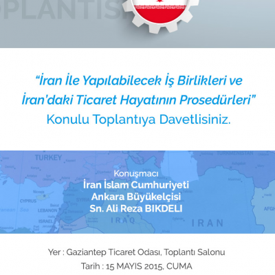 İran’ın Türkiye ve özellikle Gaziantep ekonomisi için büyük fırsatlar barından bir Pazar olması öngürüsü ile Gaziantep Ticaret Odası’nca 15.05.2015 Cuma günü saat 09:00’da Ticaret Odası toplantı salonunda İran İslam Cumhuriyeti Ankara Büyükelçisi Sayın Alireza BIKDELI’nin katılımıyla bir toplantı o...