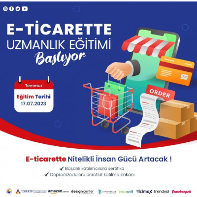 Türkiye Odalar ve Borsalar Birliği koordinasyonunda; başta Amazon Türkiye, Trendyol ve Yemeksepeti olmak üzere, Askon Design Center, Hipotenüs, Ideasoft, Ticimax ve TOBB ETÜ Sürekli Eğitim Merkezi (SEM) işbirliği ve katkılarıyla 17 Temmuz 2023 tarihinde E-Ticarette Uzmanlık Eğitimi başlatılacaktır.