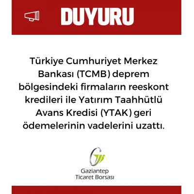 Buna göre, deprem/afet bölgesindeki illerde (Adana, Adıyaman, Diyarbakır, Hatay, Gaziantep, Kahramanmaraş, Kilis, Malatya, Osmaniye, Şanlıurfa) kurulu firmaların; 6 Şubat 2023 (dahil) ila 30 Nisan 2023 (dahil) tarihleri arasındaki ihracat ve döviz kazandırıcı hizmetler reeskont kredileri ile yatırım taahhütlü avans kredileri geri ödemelerine 180 güne kadar fai...