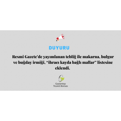 01.06.2021 tarih ve 31498 sayılı Resmi Gazetede yayınlanan "İhracı Kayda Bağlı Mallara İlişkin Tebliğde Değişiklik Yapılmasına Dair Tebliği"ne göre ihracı kayda bağlı mallar listesine, makarna (söz konusu GTİP'in alt açılımlarında yer alan şehriye, kuskus, mantı, erişte ve hazır/anında noodle gibi tüm ürünler da...
