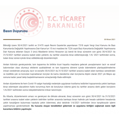 Ticaret Bakanlığı tarafından Çek düzenlemesiyle ilgili oluşan tereddütleri gidermek ve uygulama birliğini sağlamak amacıyla ilgili kurumlara yönelik bildirim yapılmıştır.