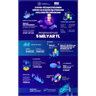KOSGEB, COVİD-19 salgını sebebiyle gelir kaybına uğramış veya nakit akışı bozulmuş ama istihdamını koruyan imalat sektörlerinde faaliyet gösteren mikro ve küçük ölçekli işletmelere yönelik ‘Covid-19'dan Etkilenen Mikro ve Küçük İşletmelere Hızlı Destek Programı’nı başlattı.