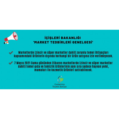 T.C. İçişleri Bakanlığınca yayımlanan ve; 29 Nisan 2021 Perşembe günü saat 19:00 ile 17 Mayıs 2021 Pazartesi günü saat 05:00 aralığında uygulanacak olan Tam Kapanma Tedbirlerini belirleyen 27.04.2021 tarih ve 89780865-153-7576 sayılı Genelge uyarınca aşağıda belirtilen hususlara dikkat edilmesi gerektiğini bilgilerinize sunarız.